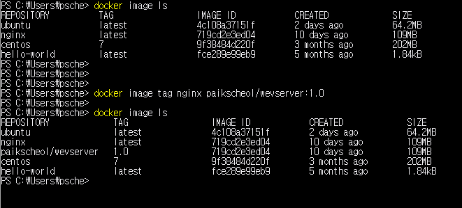 - nginx의 이름을 paikscheol/webserver로 바꿔보자