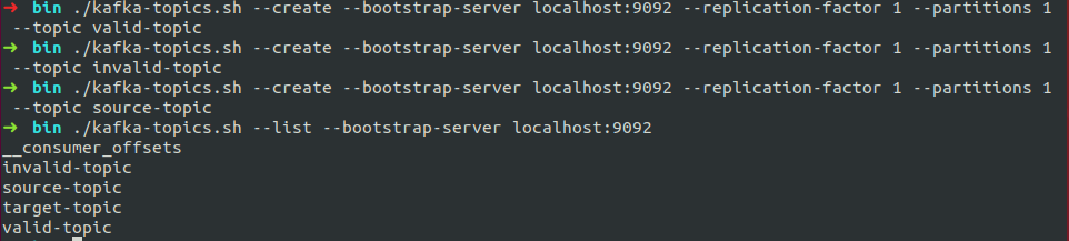 $ ./kafka-topics.sh --create --bootstrap-server localhost:9092 --replication-factor 1 --partitions 1 --topic valid-topic