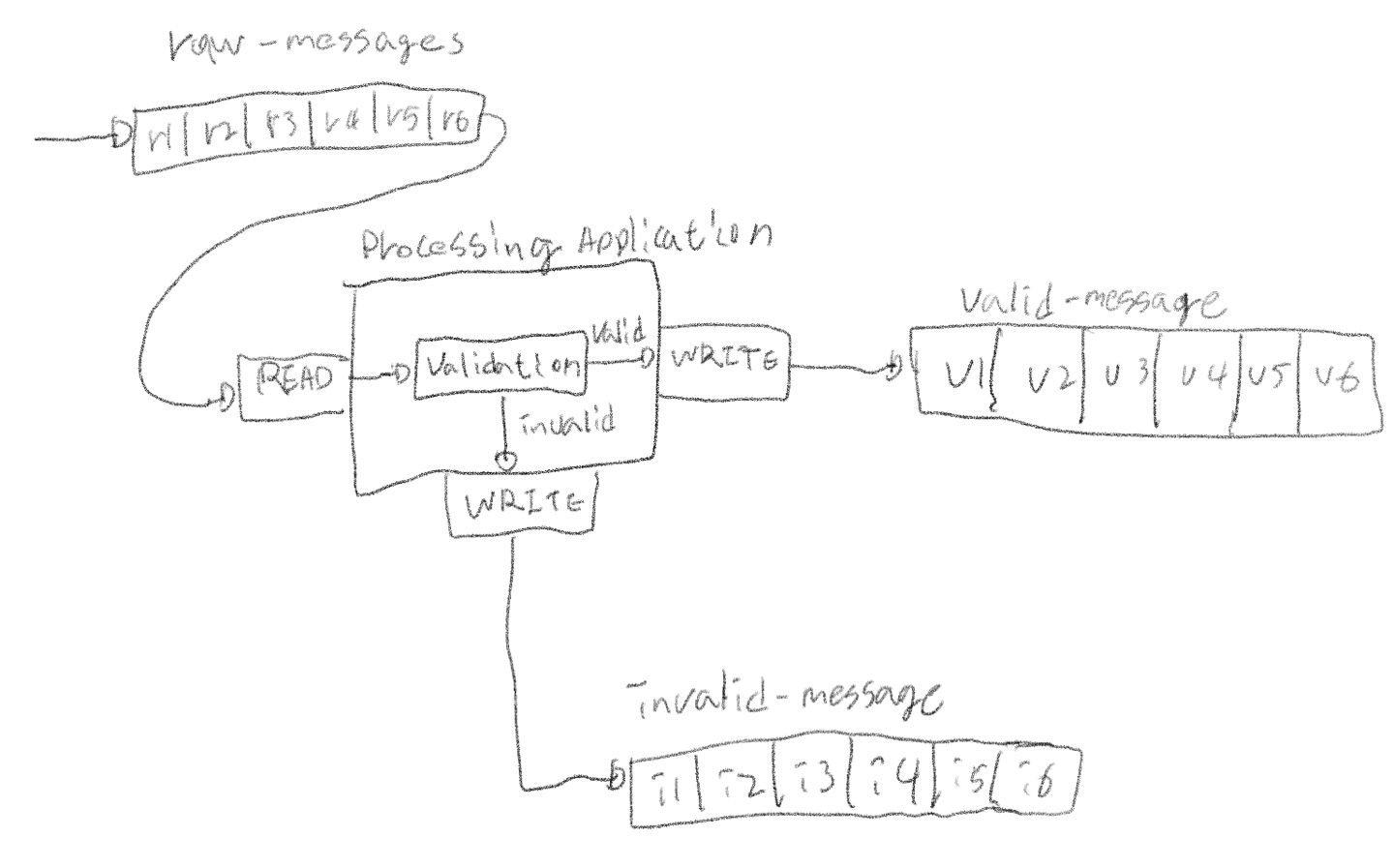 - 이벤트를 검사하고 올바른 메시지는 valid-message topic에 쓰고, 잘못된 메시지는 invalid-message 토픽에 기록한다.
