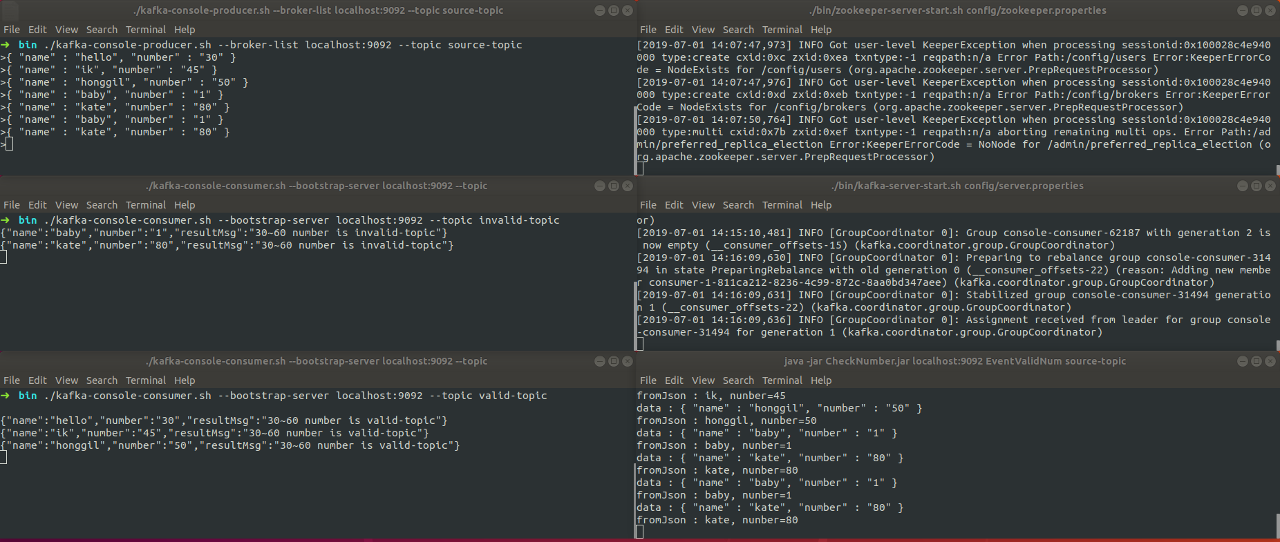$ java -jar CheckNumber.jar localhost:9092 EventValidNum source-topic valid-topic invalid-topic