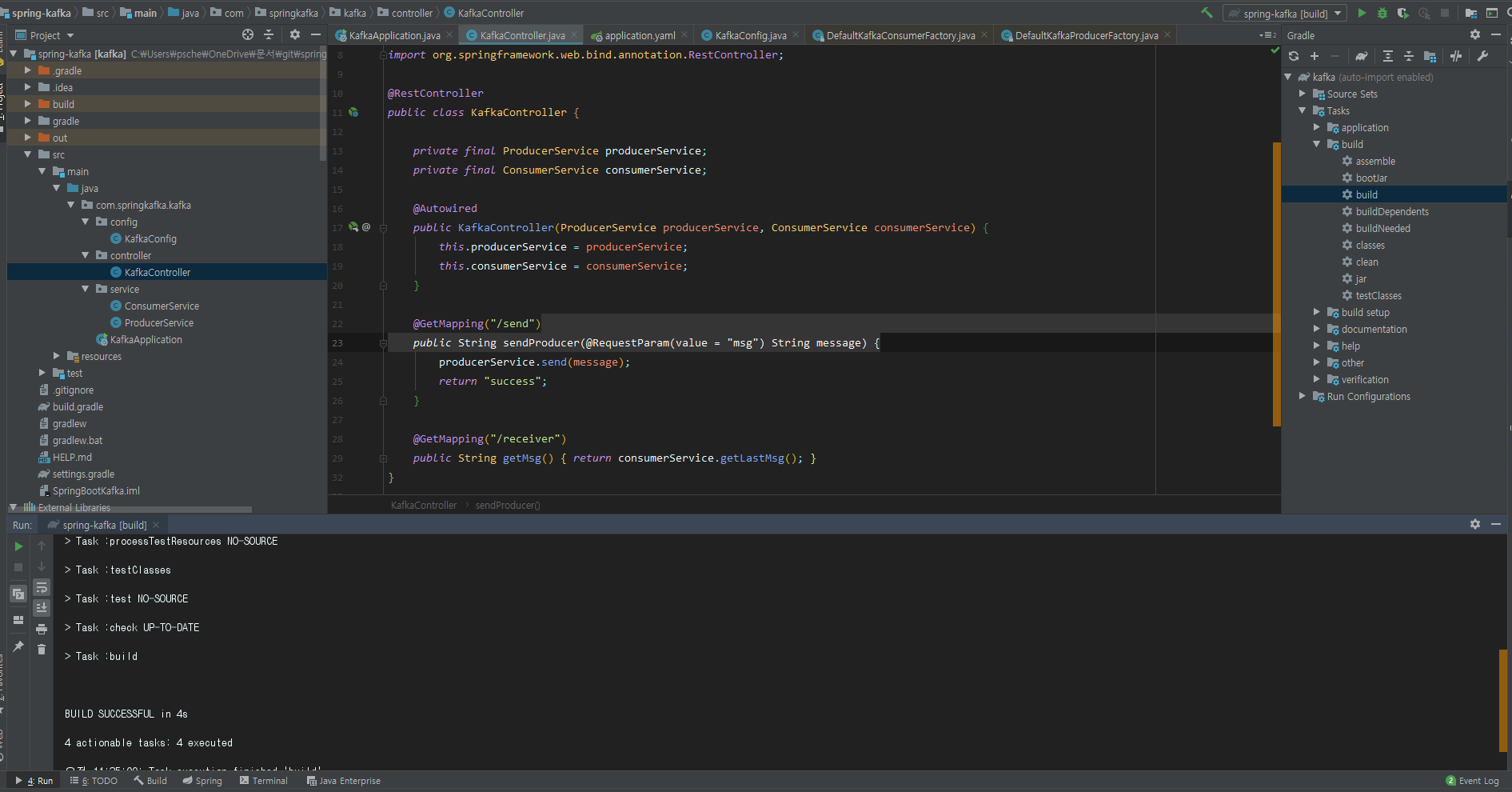 - Producer를 통해 메시지를 보내고 Consumer를 통해 topic에 있는 데이터를 받아오는 프로그램을 간단하게 만들어보자.