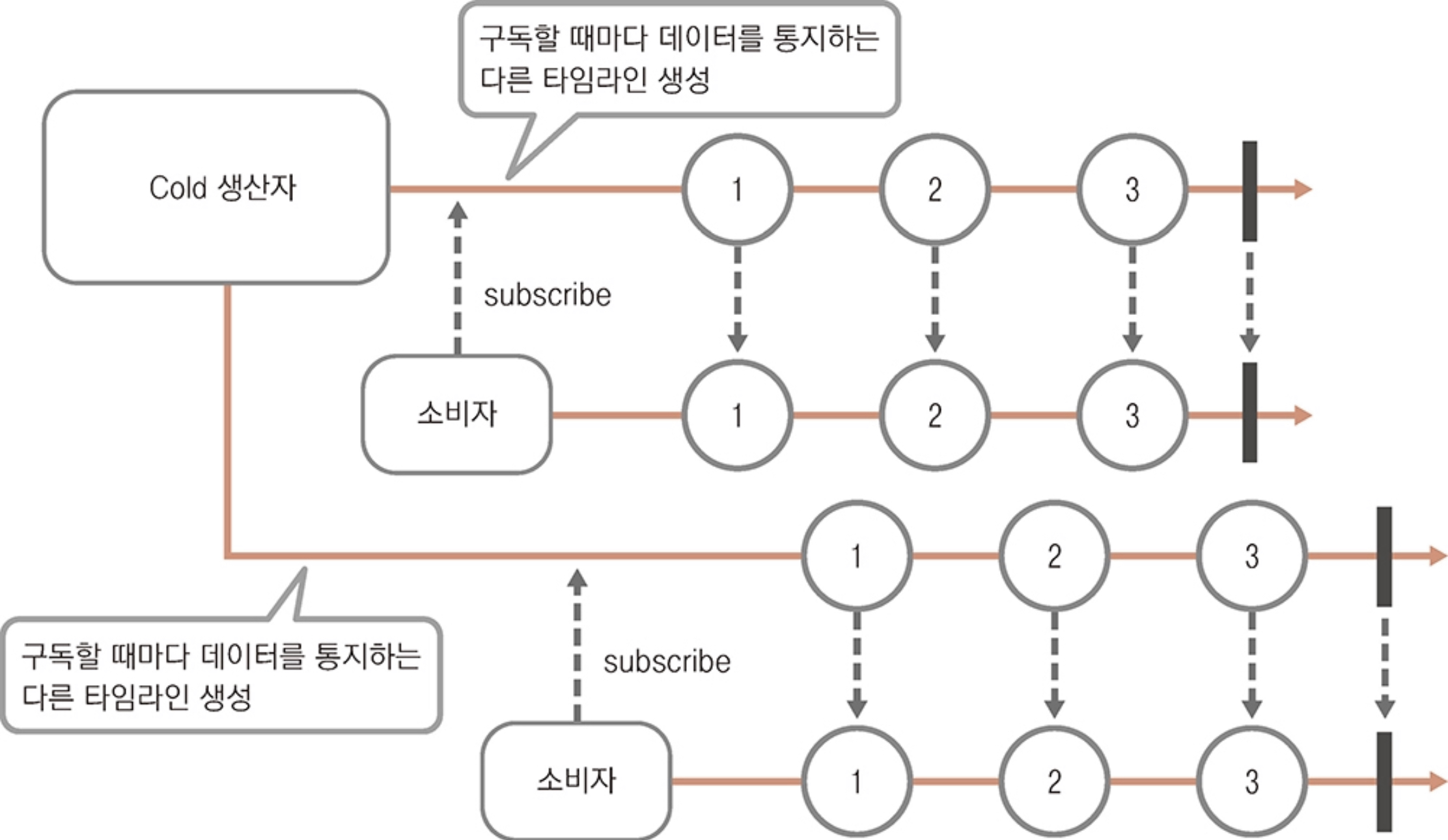 1개의 소비자와 구독관계를 맺는 것으로 통지하는 데이터의 타임라인을 구독할 때마다 생성한다. 그래서 생산자를 구독하면 생산자 처리가 시작된다.(RxJava는 기본적으로 Cold Constructor)