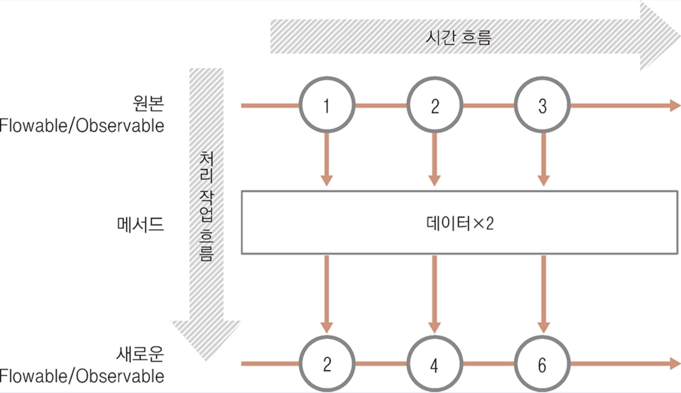 RxJava는 생산자가 통지한 데이터가 소비자에게 도착하기 전에 불필요한 데이터를 삭제하거나 소비자가 사용하기 쉽게 변경해야 할 때가 있는데 이 때 Flowable/Observable의 메서드에서 새로운 Flowable/Observable을 반환하며 해당 메서드를 서로 연결해나가며 최동 데이터를 통지하는 Flowable/Observable을 생성한다. 그래서 통지하는 데이터를 생성하거나 필터링 또는 변환하는 메서드이다.