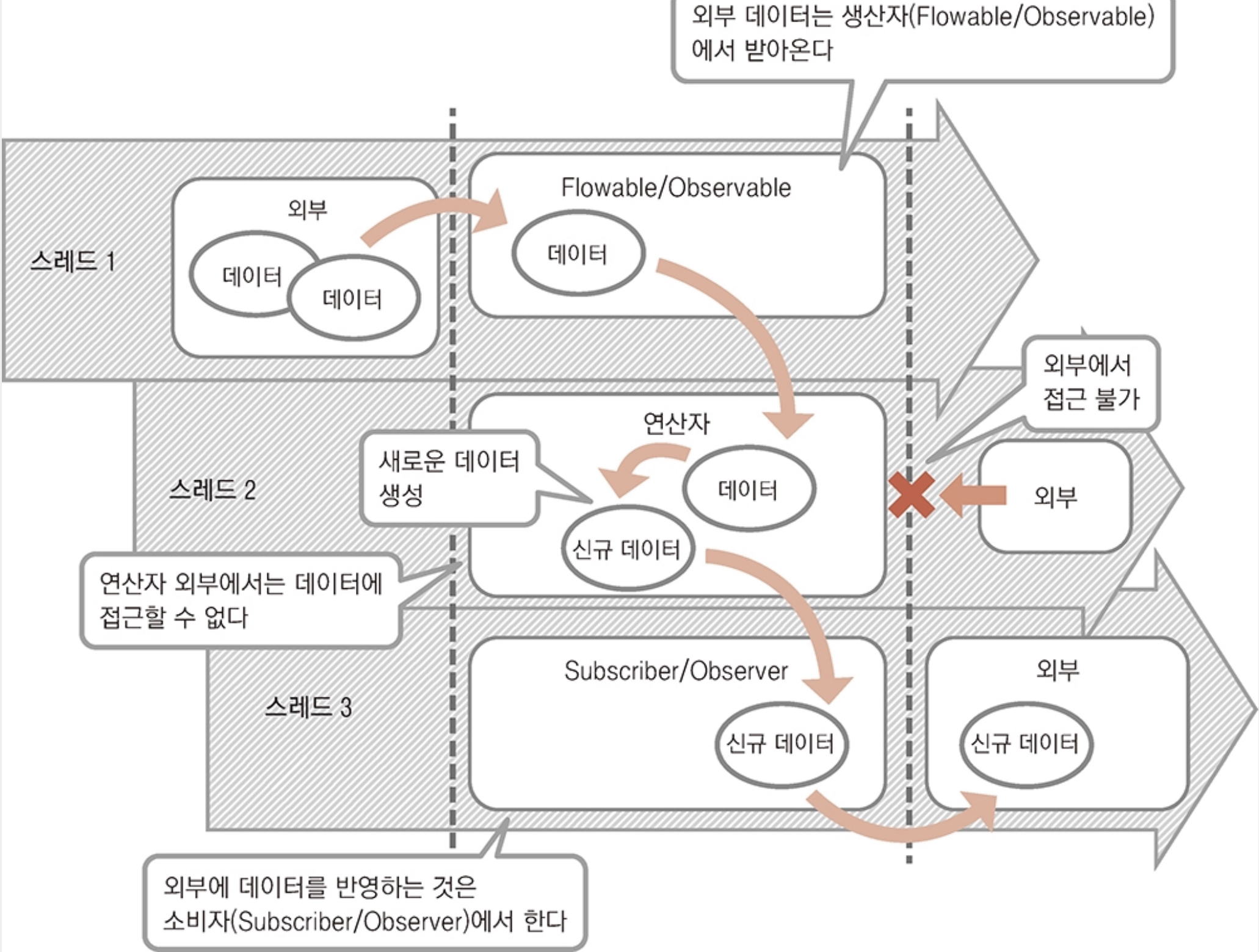 - 비동기 처리를 할 수 있다. Reactive Streams 규칙의 근간인 Observable 규약이라는 RxJava 개발 가이드라인을 따르면 직접 스레드를 관리하는 번거로움에서 해방되고 구현도 간단하게 할 수 있다.