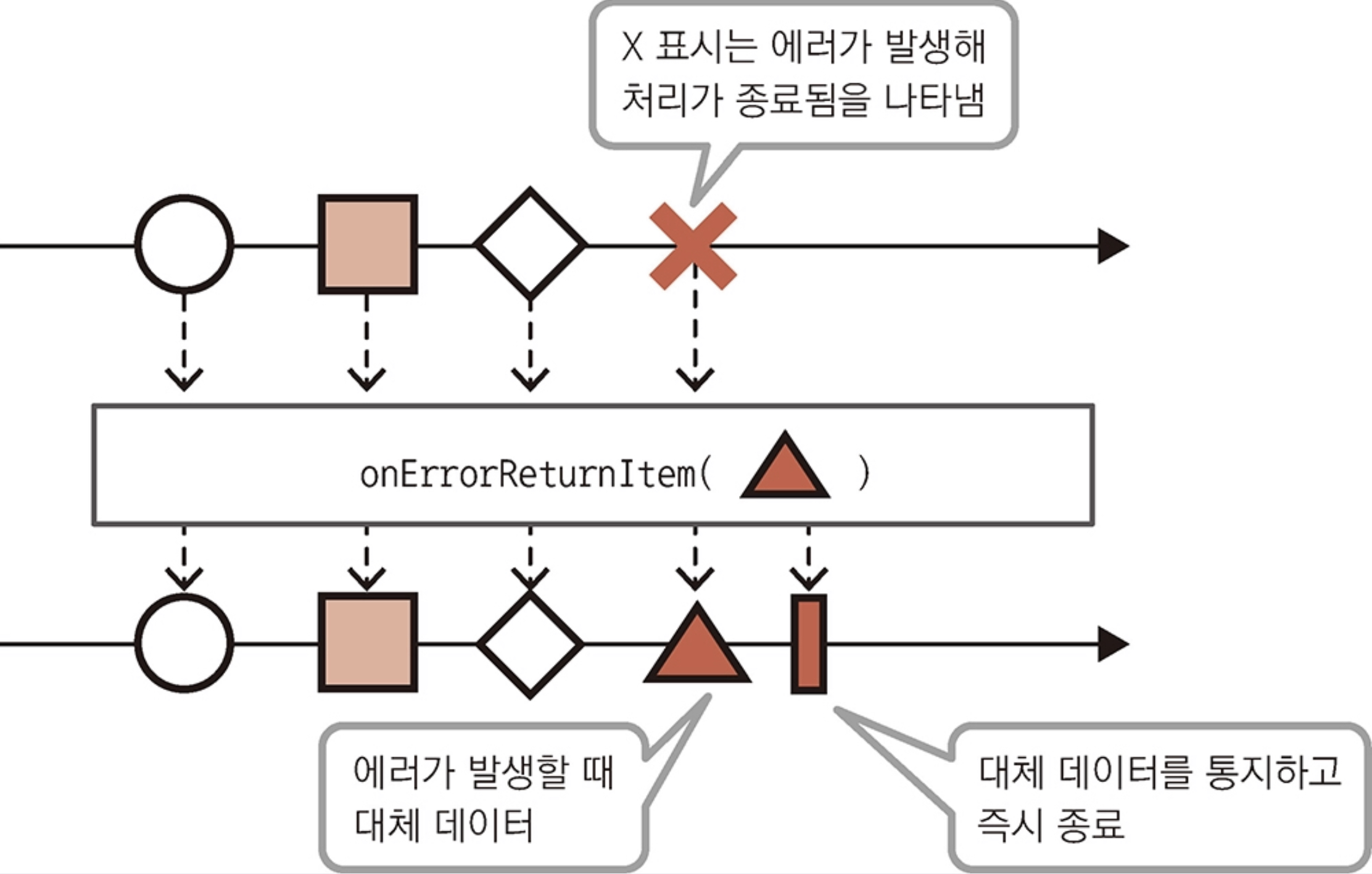 처리가 정상적으로 끝나지 못하고 중간에 에러를 통지하게 되면 해당 위치에 X표시를 하고 특정에러가 통지된다. 예를들어 onErrorReturnItem 메서드는 Flowable/Observable에 에러가 밸상하면 인자로 전달받은 데이터를 통지해 완료하는 Flowable/Observable을 생성한다.