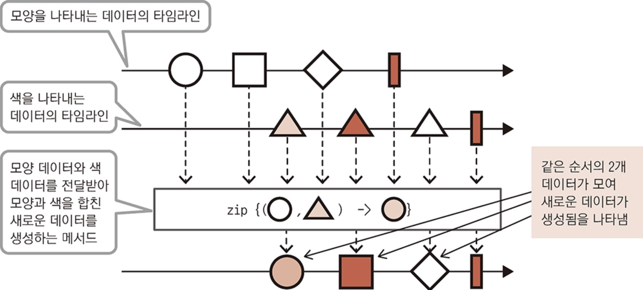 여러 개의 Flowable/Observable을 사용해 처리하는 다이어 그램으로 Observable에서 데이터를 받아 새로운 데이터를 만들어 통지하는 Flowable/Observable을 생성한다. 원본Flowable/Observable이 여러 개라면 원본Flowable/Observable의 데이터 통지 시점이 각각 다를 수 있는데, zip 메서드는 통지되는 데이터의 순서에 따른다. 즉, 한쪽이 먼저 첫 번째 데이터를 통지해도 다른 한쪽이 첫 번째 데이터를 통지할 때가지 데이터 결과를 통지하지 않고 시점에 맞춰서 생성한다.