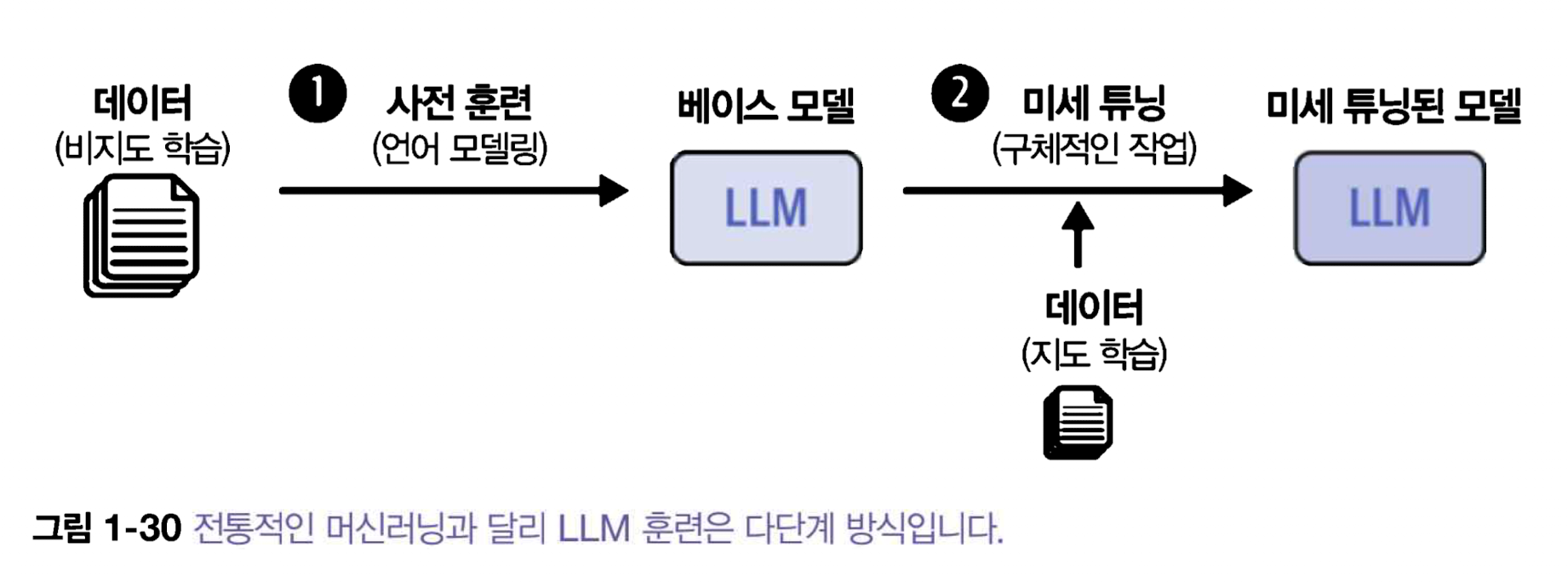 - 미세튜닝 : 미세튜닝(fine-tuning) 또는 사후 훈련(post-training)이라고 부르며, 이전에 훈련된 모델을 사용해 구체적인 작업에 맞춰 추가로 훈련시키고, 이를 통해 LLM이 특정 작업에 적응하거나 원하는 행동을 수행할 수 있다.