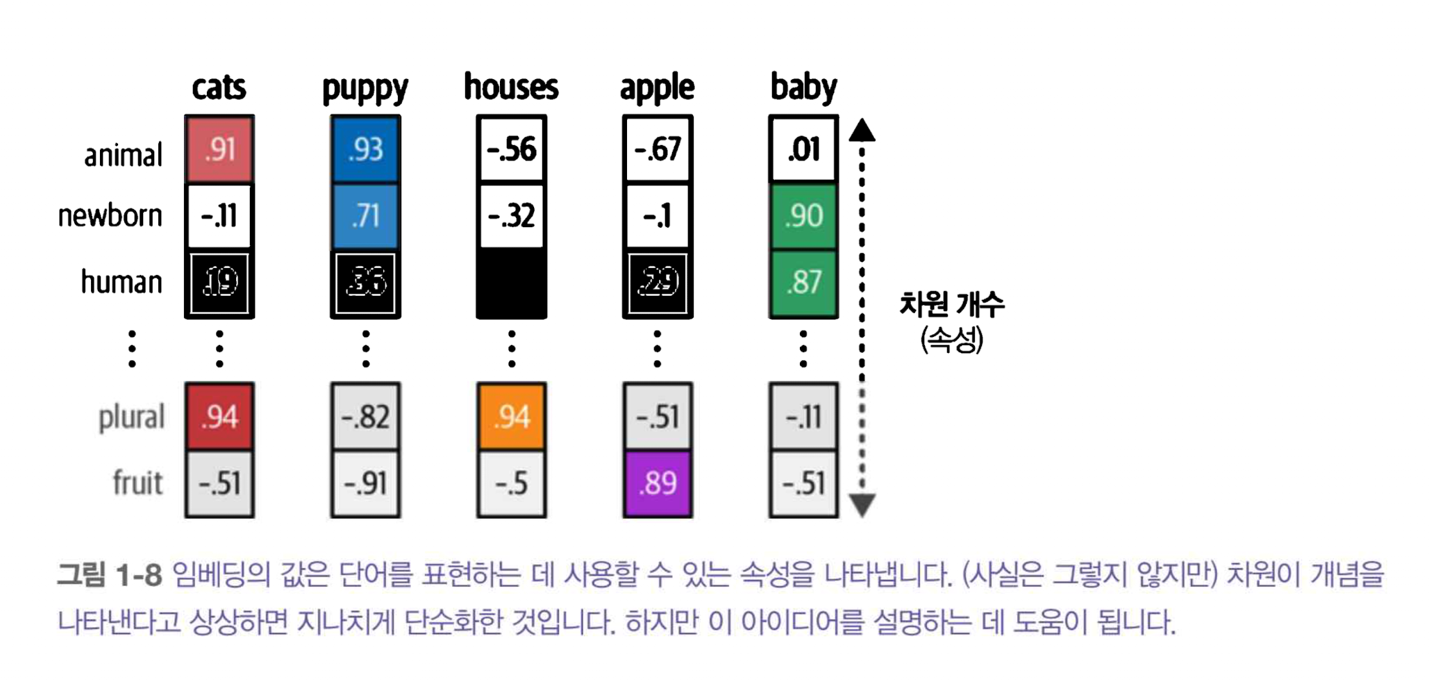 임베딩은 단어의 의미를 표현하기 위해 여러 속성을 가질 수 있으며, 임베딩의 크기가 고정이기 때문에 임베딩 속성은 단어의 정신적 표상(mental representation)을 만들도록 선택