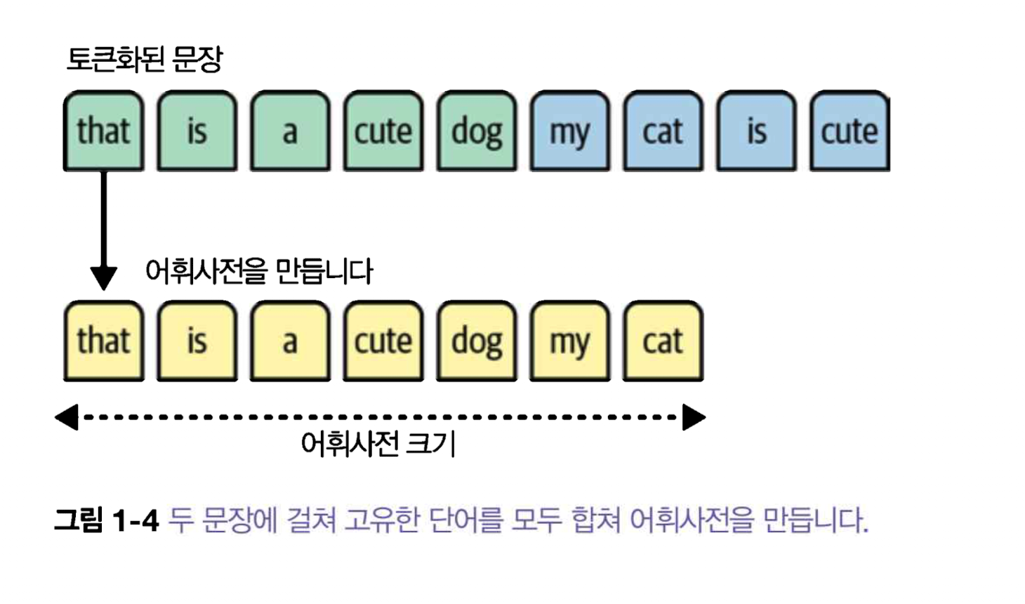 토큰화를 한 다음 각 문장의 고유한 단어를 모두 합쳐 어휘사전(vocabulary)를 생성하여 문장을 표현