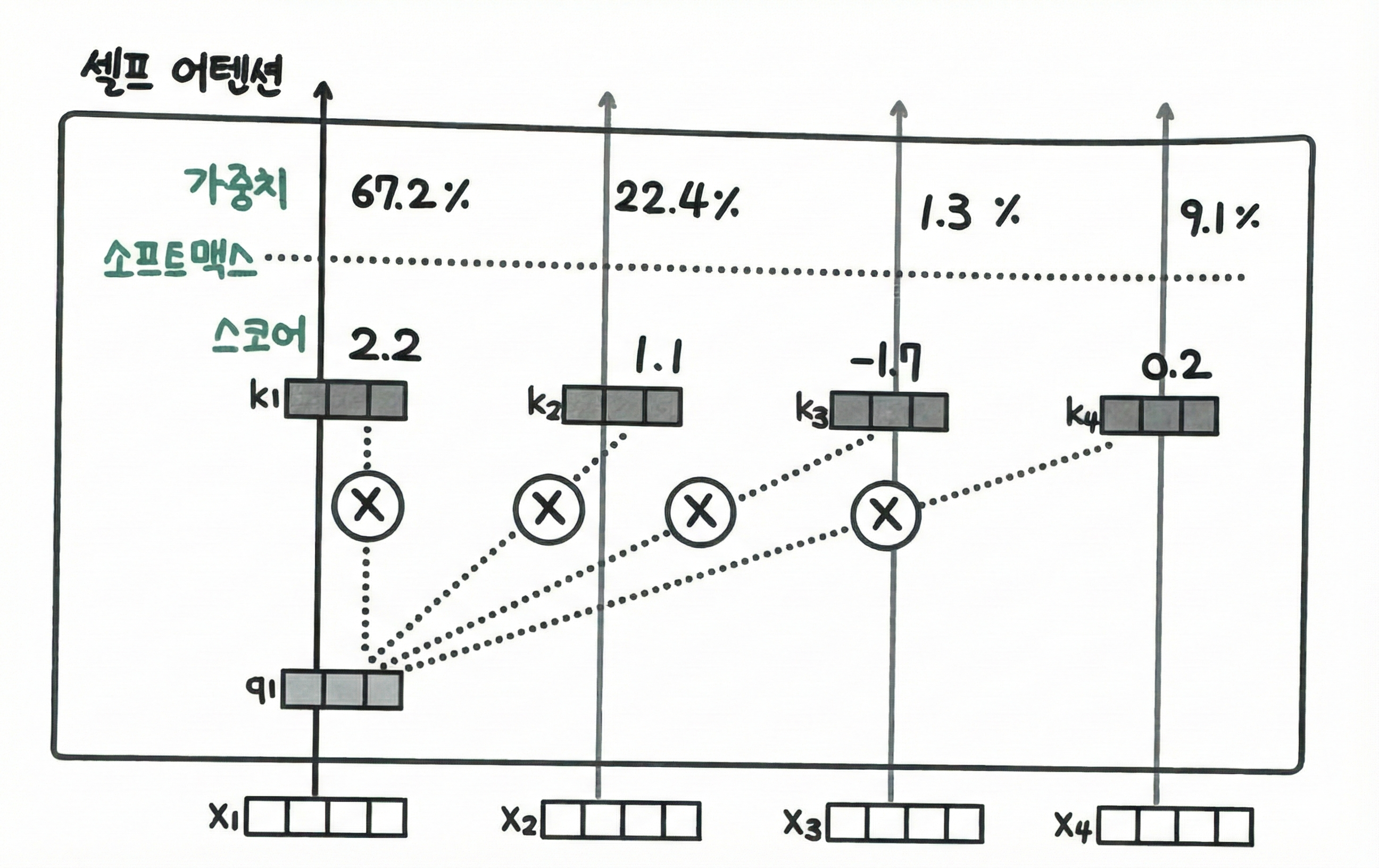 - 쿼리와 키를 곱해 스코어(score)를 합이 1이 되도록 소프트맥스softmax)를 취해 가중치(weights)로 바꾼다.