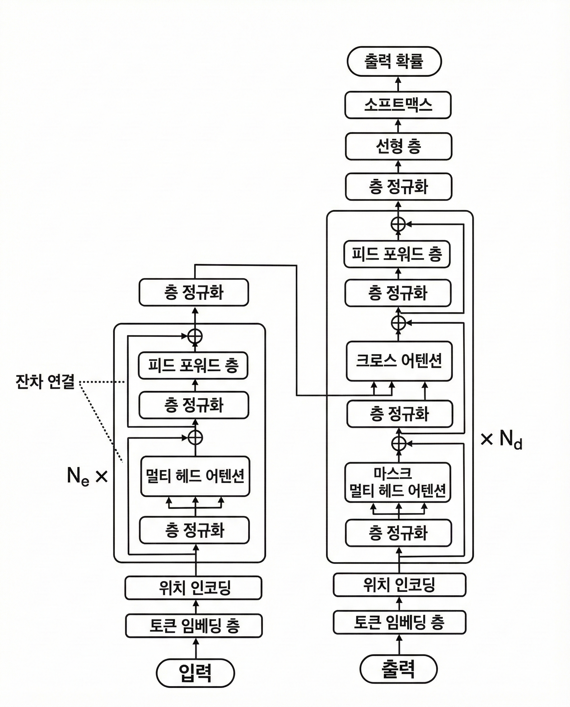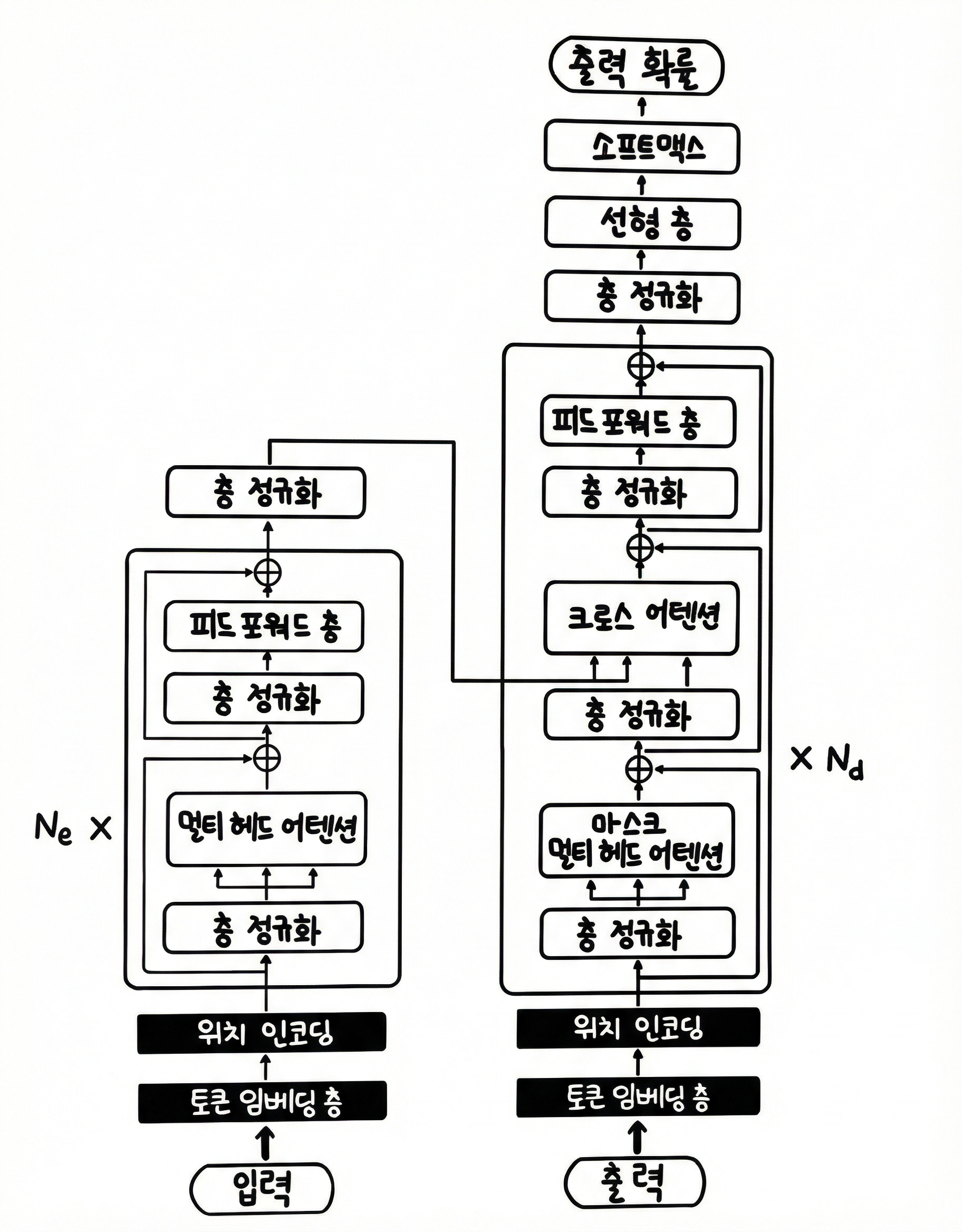 - 층 정규화 → 멀티 헤드 어텐션 → 합 → 층 정규화 → 피드포워드 층 → 합