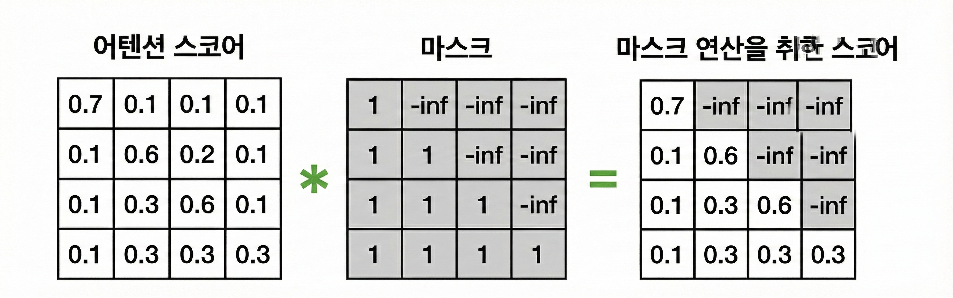 따라서 어텐션을 그대로 활용하면 미래 시점에 작성해야 하는 텍스트를 미리 확인하게 되는 문제가 발생한다. 이를 방지하기 위해 특정 시점에는 그 이전에 생성된 토큰까지만 확인할 수 있도록 마스크를 추가한다.