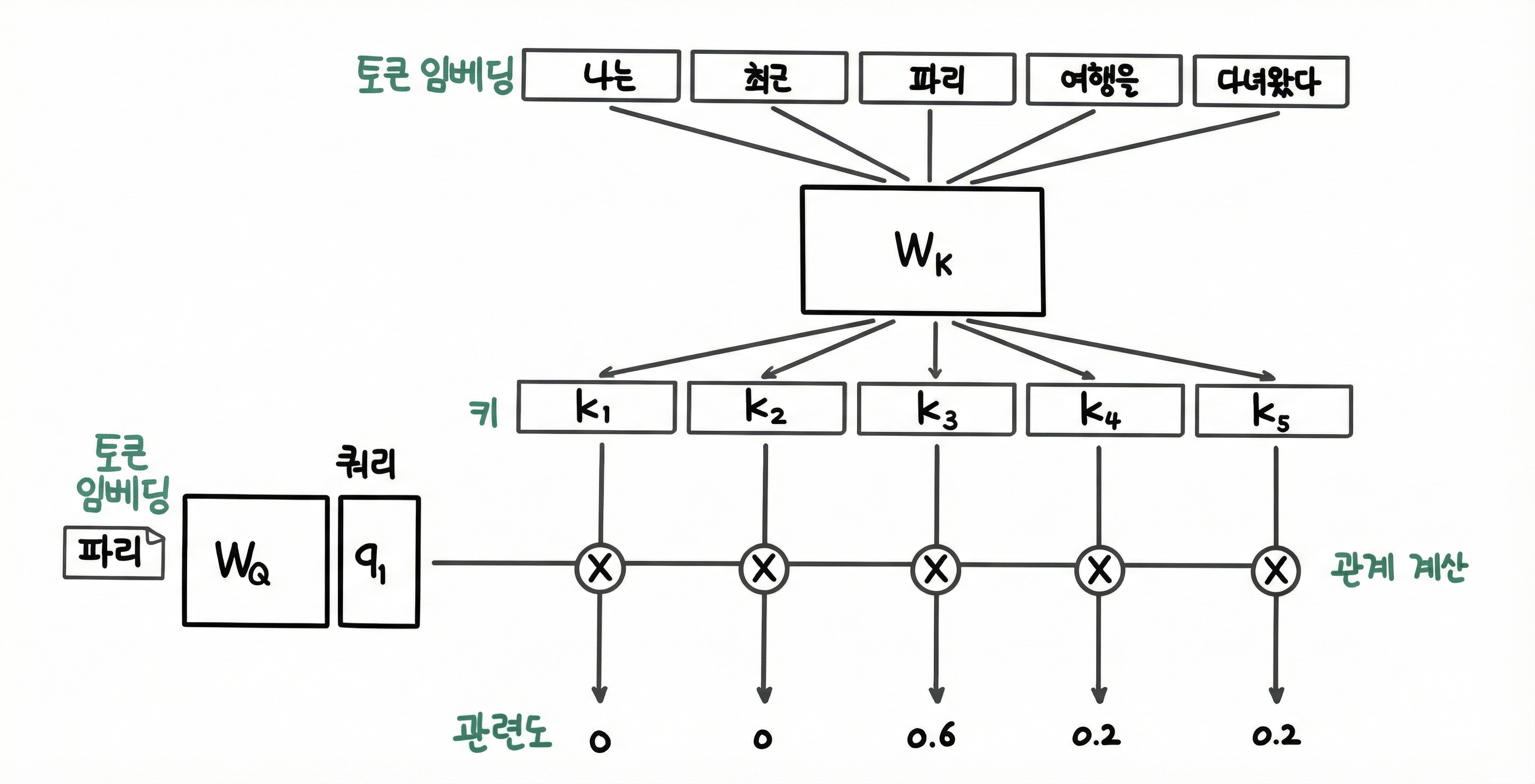 트랜스포머는 이와같은 문제를 파히기 위해 토큰 임베딩을 반환하는 가중치 $W_Q, W_K$를 도입했다.