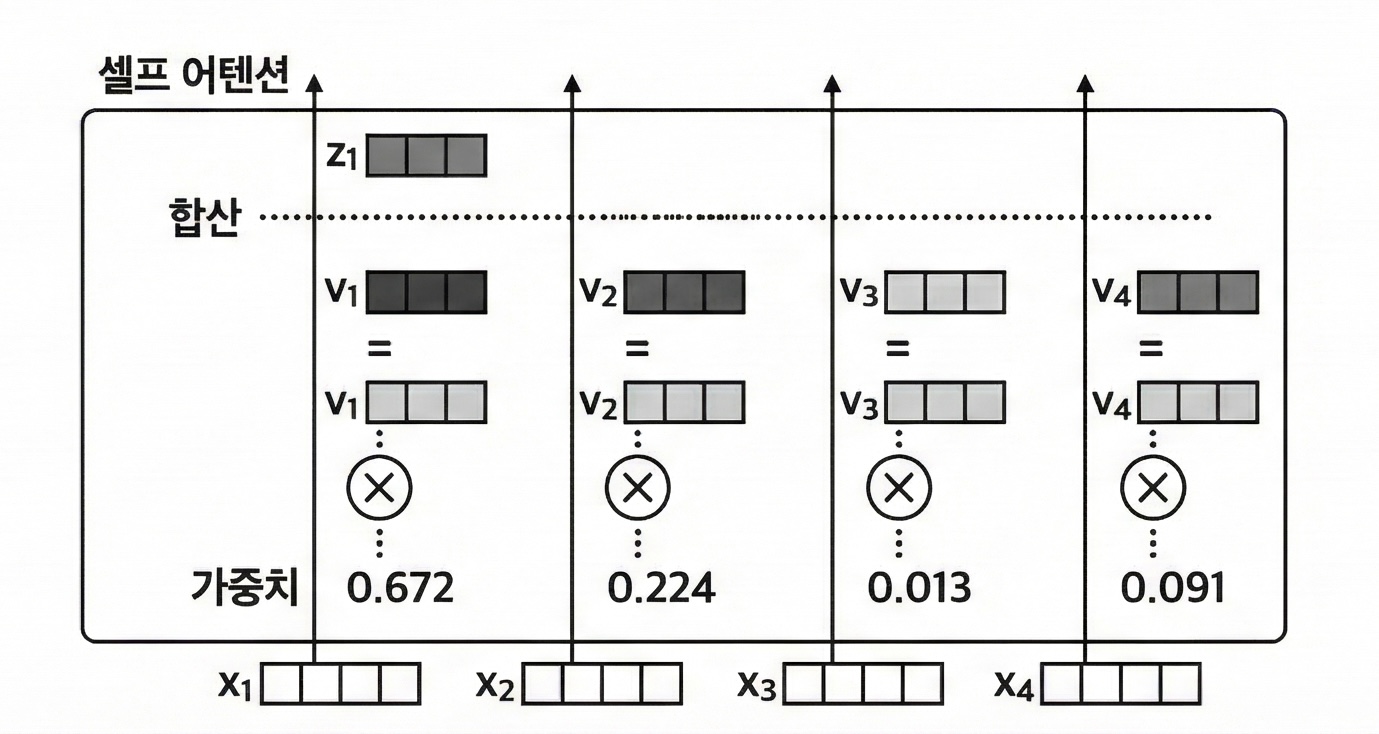 트랜스포머에서는 값(Value)도 토큰 임베딩 가중치$(W_V)$를 통해 변환한다. 이렇게 세 가지 가중치를 활용하여 토큰 간의 관계를 계산하고, 주변 맥락을 적절히 반영하는 방법을 학습한다. 최종적으로 쿼리와 키의 관계를 계산한 관련도 값과 값 가중치$(W_V)$로 변환한 값(Value)을 가중합하면 된다.