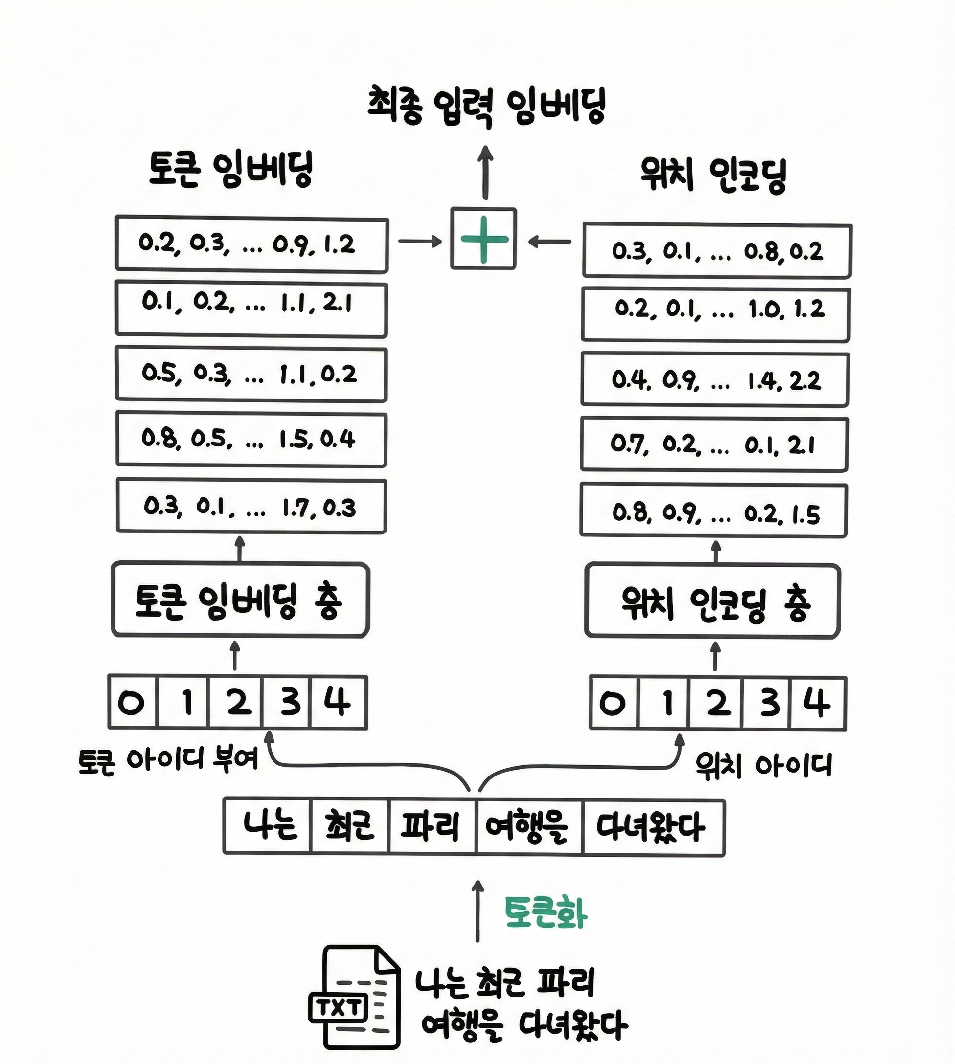- 토큰 아이디를 토큰 임베딩 층을 통해 여러 숫자 집합인 토큰 임베딩(Token Embbedding)으로 변환