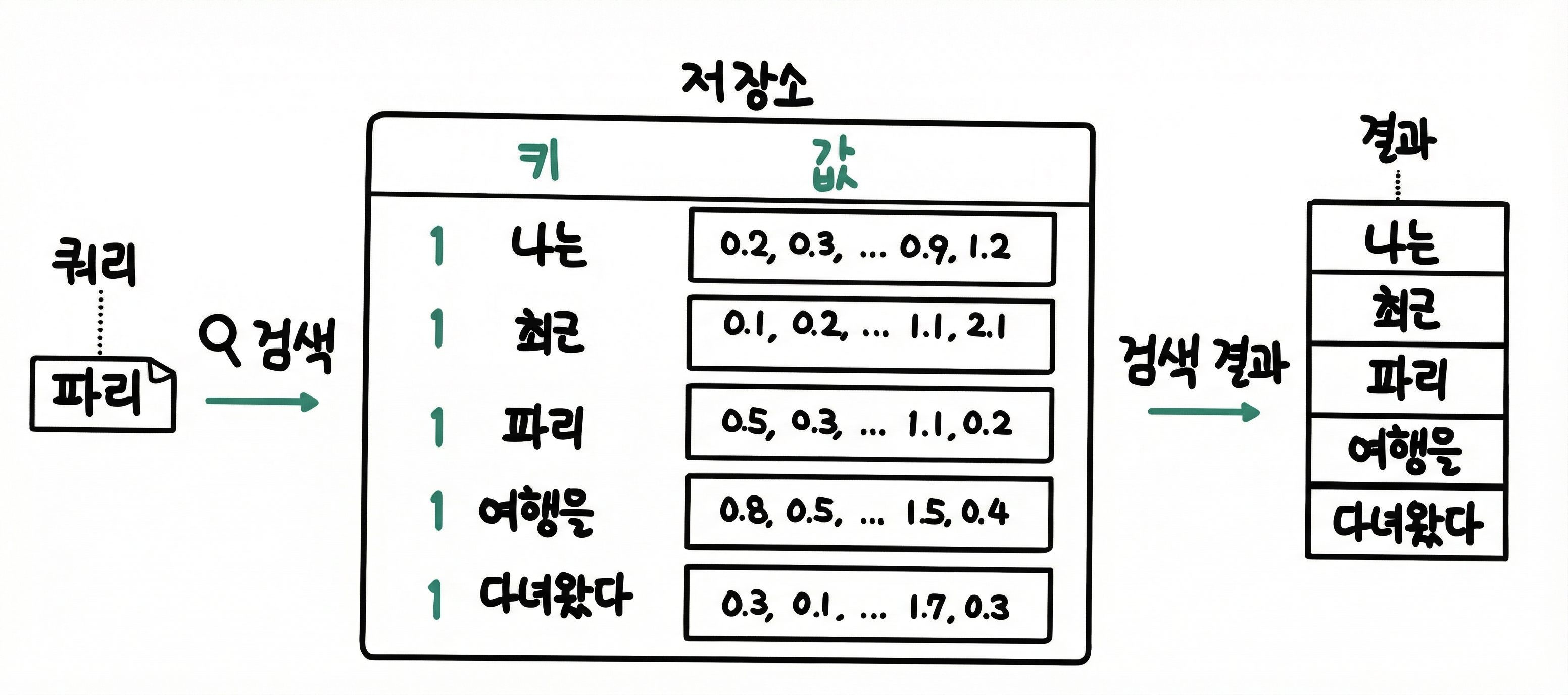 - 키(Key) : 수 많은 자료 중 쿼리와 관련이 있는지 계산하기 위해 문서가 가진 특징