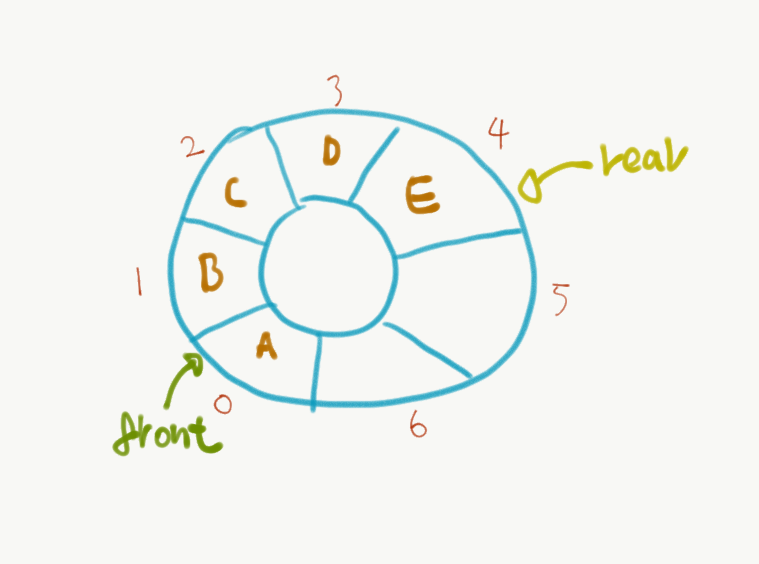 - 배열의 rear에 데이터를 삽입하면서 rear의 다음이 front와 만나면 배열이 꽉차게 됨.