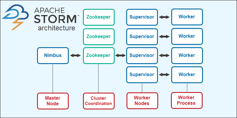 Apache Storm Apache Storm은 분산형 실시간 처리 프레임워크로써, 노드마다 초당 수백만 개의 레코드를 처리하고 한 번에 하나씩 이벤트를 처리하는 기능이 있다. 그리고 1초의 지연마저도 큰 손실이 되는 매우 민감한 어플리케이션을 다루는데 사용되고, 추천엔진 제작, 의심스런 활동 트리거 등에 사용하고 있다. 또한 상태 저장 없이(stateless), 중요한 메타데이터 정보를 유지하기 위한 조정(coordinating)을 목적으로 주키퍼를 사용한다. 클러스터 구조 스톰은 마스터-슬레이브(master-slave)구조로 되어있고 님버스(nimbus)가 마스터이고, 수퍼파이저(supoervisor)가 슬레이브가 된다. 님버스(nimbus) : 스톰 클러스터 마스터노드로 클러스터 안에서 나머지 모든..