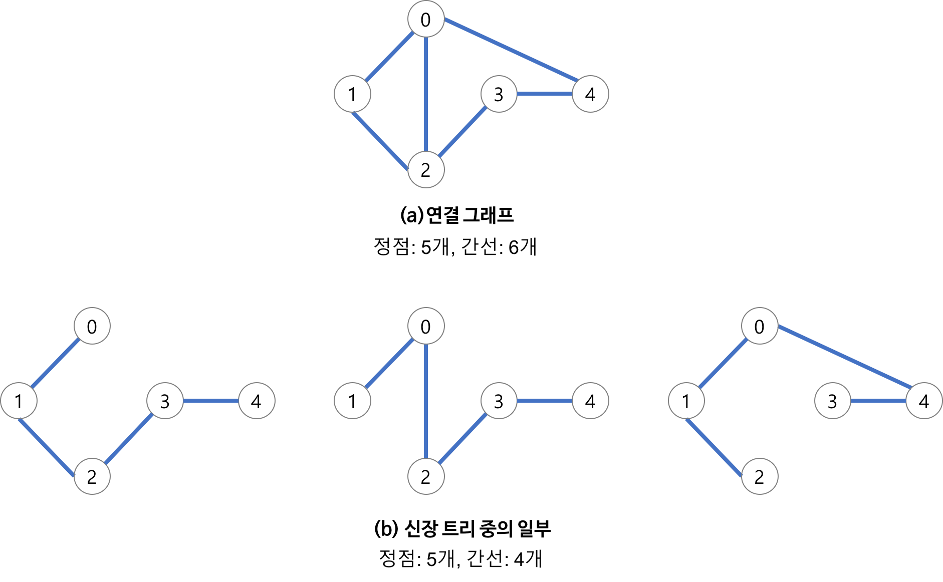 Spanning Tree(신장트리)그래프 내의 모든 정점을 포함하는 트리 모든 정점들이 연결되어 있어야하고, 사이클을 포함해서는 안된다. 그래프의 최소 연결 부분 그래프이다. 최소연결 = 간선의 수가 가장 적다 그래프에 있는 n개의 정점(vertax)을 가지는 그래프의 최소 간선(edge) 수는 (n-1)개이고, (n-1)개의 간선으로 연결되 있으면 필연적으로 트리형태가 되므로 Spanning Tree가 되므로 즉, 그래프에서 일부 간선을 선택해서 만든 트리이다. 신장트리는 깊이 우선 탐색이나 너비 우선 탐색 을 이용하여 사용된 간선만 모으면 만들 수 있다. 하나의 그래프에 많은 신장 트리가 존재할 수 있다. [시작 정점을 바꾸어 가면서 깊이 우선 탐색을 하여 만든 신장 트리 중 일부] 깊이우선 탐색알고..