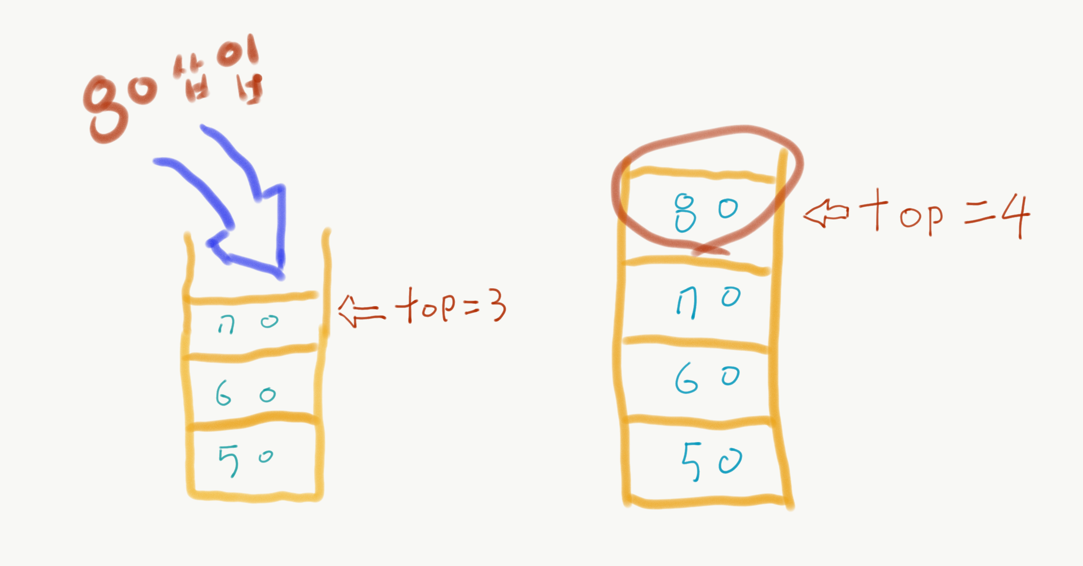 스택(Stack) 먼저 들어간 데이터가 가장 마지막에 나오는 구조(Last In, First Out : LIFO) 삽입과 삭제가 한쪽 끝에서만 자료를 넣고 뺄 수 있다. ex) 자동메모리, 네트워크 프로토콜 스택(Stack)의 주요 기능 스택의 초기화 int stack[100]; //스택 배열 int size = 0; // 스태의 크기 삽입(Push) 스택 위에 새로운 노드를 쌓는 작업 void push(int data) { stack[size] = data; size = size + 1; } 삭제(Pop) 스택에서 최상위 노드를 걷어내는 작업 int pop() { if (size < 0) return 0; int pop = stack[size]; size = size - 1; return pop; } ..